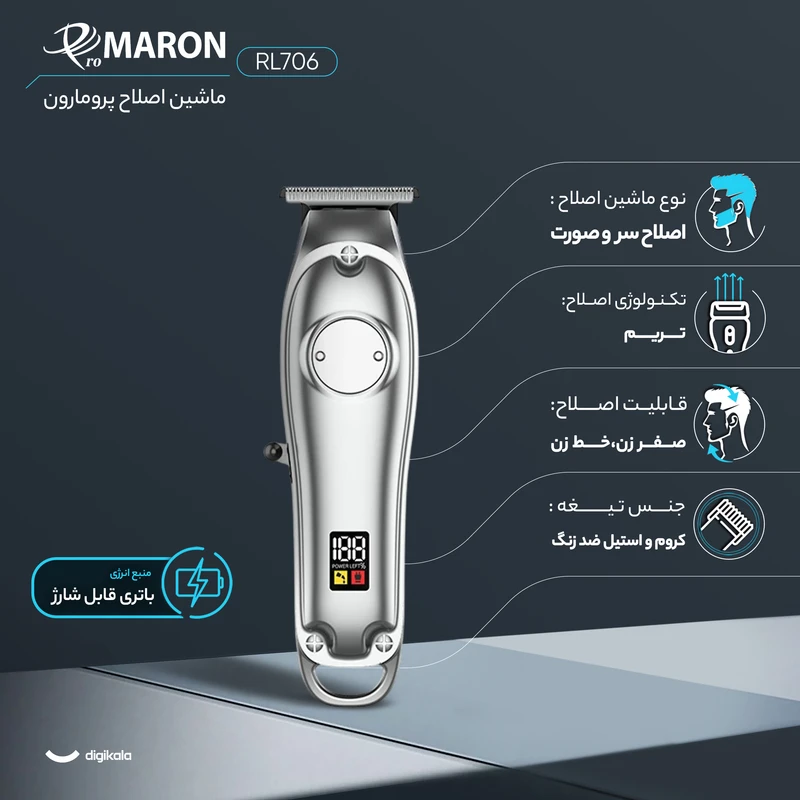 طراحی بدنه ارگونومیک مقاومت در برابر صفحه نوع شارژ متحرک قابلیت اصلاح با شماره صفر باتری ۶۰۰ میلی امپر جنس تیغه کروم ضد زنگ مدت شارژ ۱۲۰ دقیقه گارانتی شرکتی ۲۴ ماهه