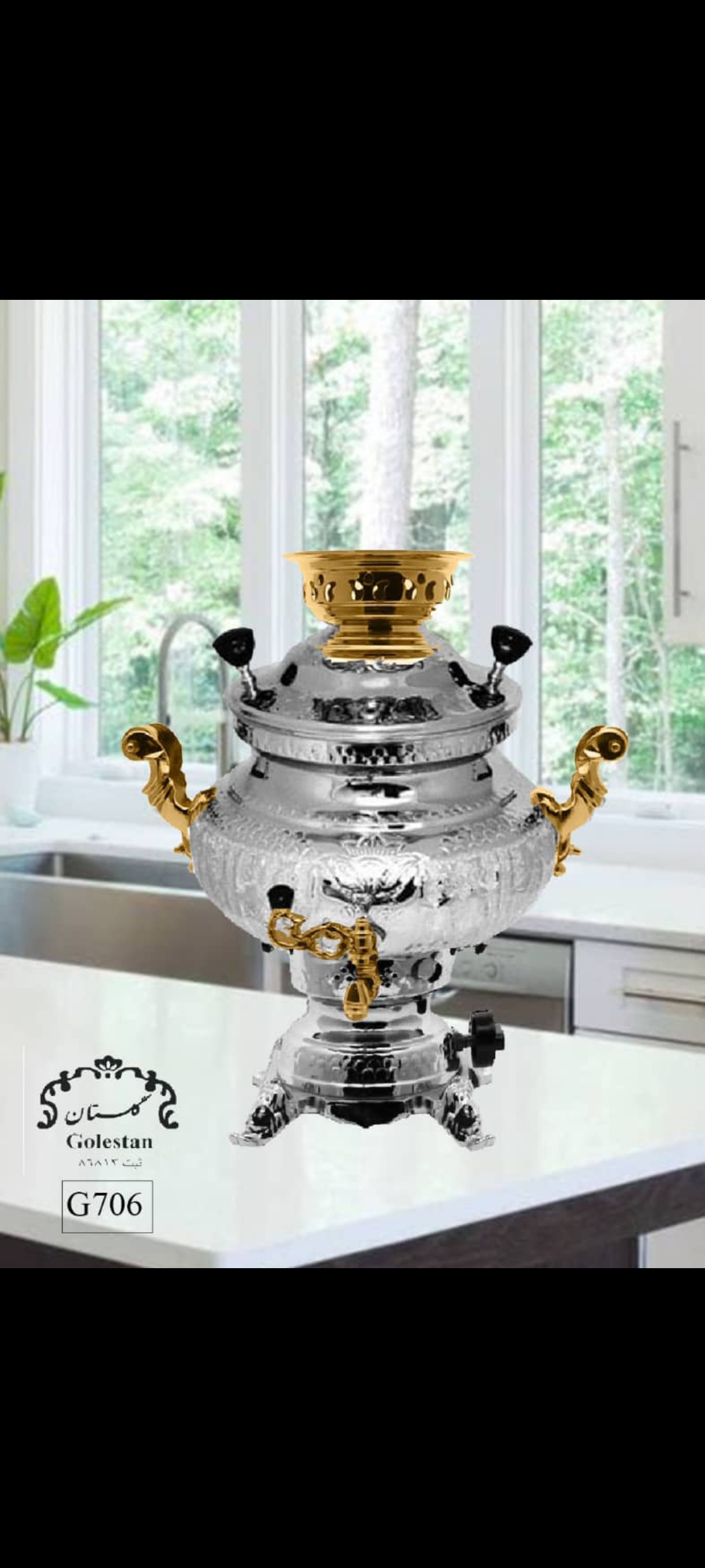 سماور گازی گلستان مدل ماریا دسته طلایی قلمکار هخامنشی سنتی ضخامت ورق ۸ میل گارانتی شرکتی ۱۸ ماهه