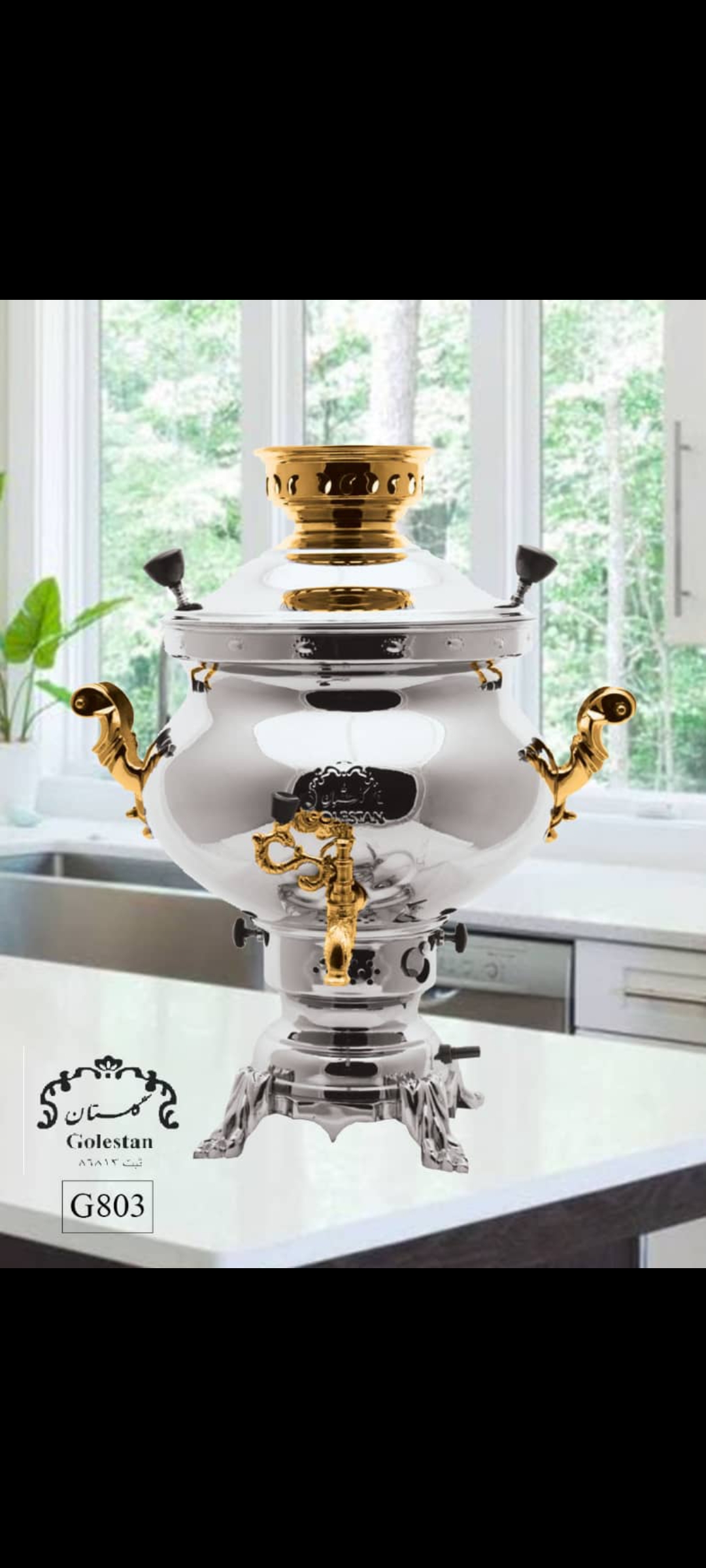 سماور گازی گلستان ۸ لیتر مدل ماریا دسته طلایی ساده ضخامت ورق ۸ میل گارانتی شرکتی ۱۸ ماهه