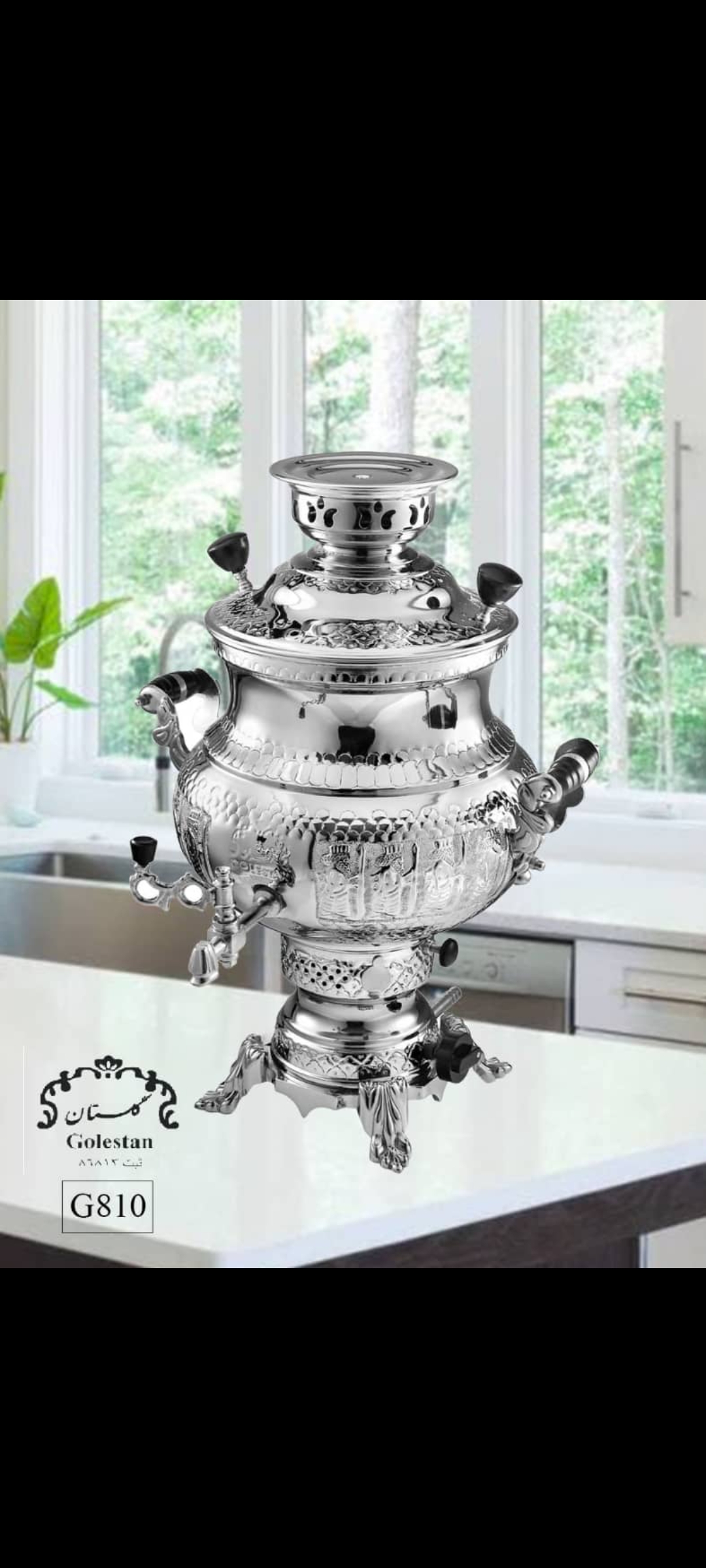 سماور گازی گلستان مدل مارال دسته کروم قلمکار هخامنشی سنتی پایه ذغالی صخامت ورق ۸ مبل گارانتی شرکتی ۱۸ ماهه